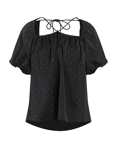 top, satin, crystals, solid color with appliqués, square neckline, short sleeves, without pockets, hand wash, do not bleach, do not tumble dry