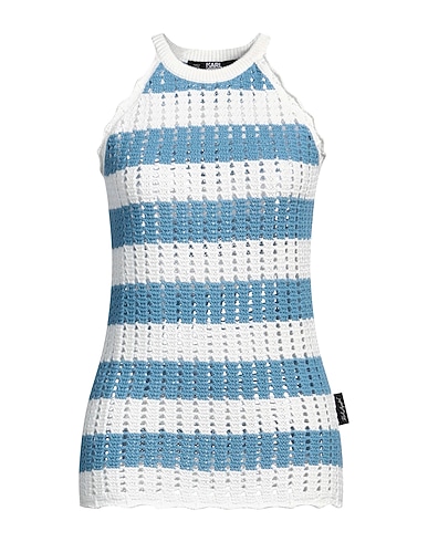 top, crochet-knit, lightweight knit, brand logo, striped, crewneck, sleeveless, without pockets, machine wash, do not bleach, do not tumble dry