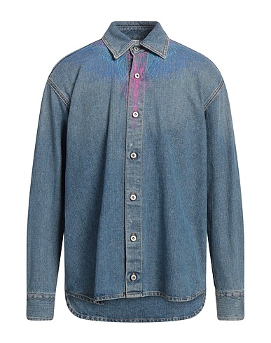 denim, faded, distressed, brand logo, solid color with print, medium wash, long sleeves, buttoned cuffs, button fastenings, without pockets, machine wash or dry clean, do not bleach, do not tumble dry
