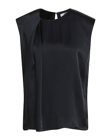 top, satin, solid color, no appliqués, crewneck, sleeveless, shoulder pads, partially lined, 1 button, dry clean, do not tumble dry