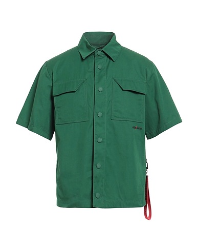 regular-fit shirt, twill, solid color with appliqués, brand logo, detachable application, embellished, classic collar, short sleeves, snap fastenings, two chest pockets, machine wash, do not bleach, do not tumble dry