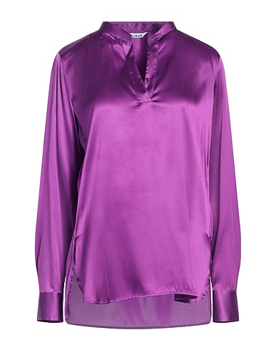 top, satin, solid color, no appliqués, v-neck, long sleeves, buttoned cuffs, side slit hemline, stretch, dry clean, do not bleach, do not tumble dry, this brand runs small