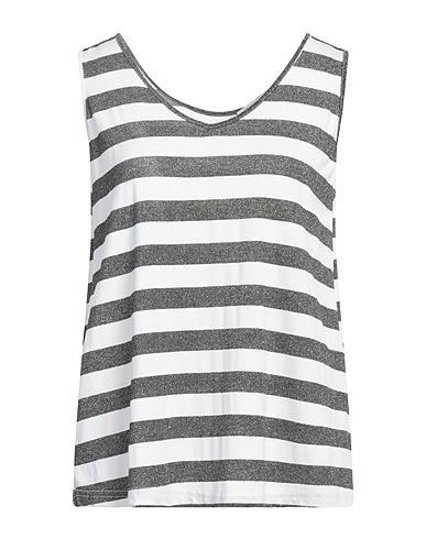 top, jersey, metallic, striped, no appliqués, v-neck, sleeveless, side slit hemline, stretch, machine wash or dry clean, do not bleach, do not tumble dry