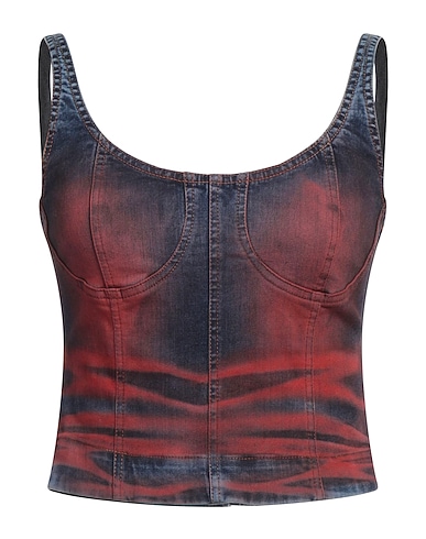 crop top, denim, stretchy fabric, tie-dyed, no appliqués, deep neckline, sleeveless, zipper fastening, machine wash, do not bleach, do not tumble dry