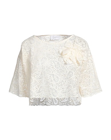crop top, lace, solid color with appliqués, brooch, crewneck, 3/4 length sleeves, stretch, machine wash or dry clean, do not bleach, do not tumble dry