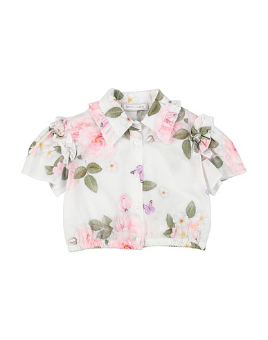 woven, floral-print, ruffles, fringes, classic collar, short sleeves, button fastenings, elasticated hem, hand wash or dry clean, do not bleach, do not tumble dry