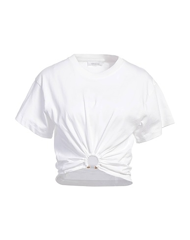 t-shirt, jersey, solid color with appliqués, gathered, brand logo, embellished, crewneck, short sleeves, hand wash, do not bleach, do not tumble dry, this brand runs small