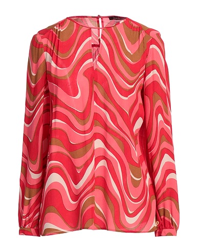 top, crepe, multicolor, brand logo, crewneck, long sleeves, 1 button, hand wash or dry clean, do not bleach, do not tumble dry