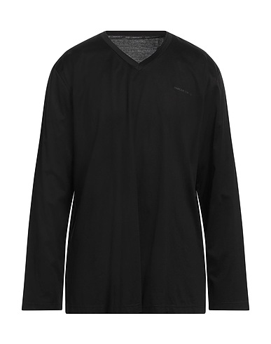 basic tee, jersey, solid color, brand logo, v-neck, long sleeves, side slit hemline, machine wash, do not bleach, do not tumble dry