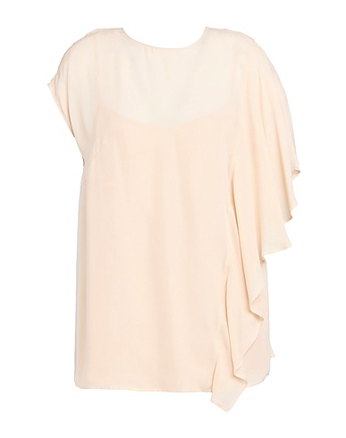 ruched top, crepe, solid color, no appliqués, crewneck, short sleeves, fully lined, button fastenings, dry clean, do not bleach, do not tumble dry