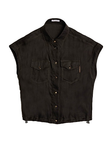 shirt, twill, solid color with appliqués, embellished, classic collar, short sleeves, button fastenings, two chest pockets, dry clean, do not bleach, do not tumble dry