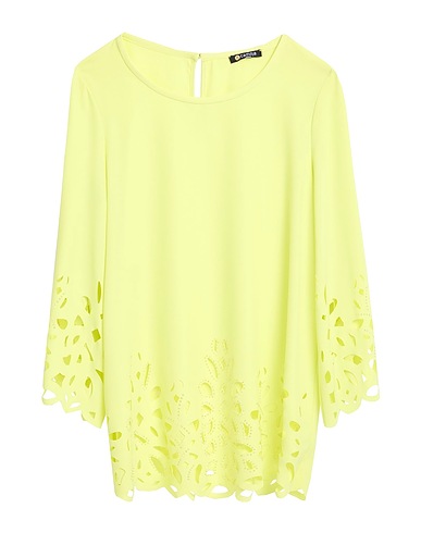 top, crepe, solid color with appliqués, crystals, crewneck, 3/4 length sleeves, stretch, machine wash or dry clean, do not bleach, do not tumble dry