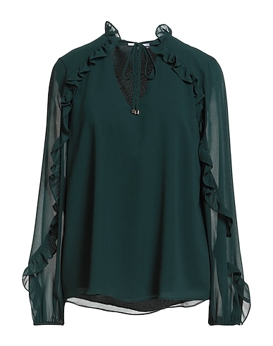 ruched top, crepe, solid color, no appliqués, v-neck, long sleeves, tie fastening, machine wash or dry clean, do not bleach, do not tumble dry
