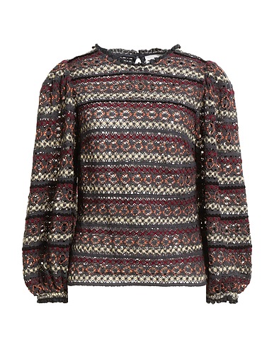 top, crochet-knit, multicolor, ruffles, crewneck, long sleeves, 1 button, hand wash or dry clean, do not bleach, do not tumble dry