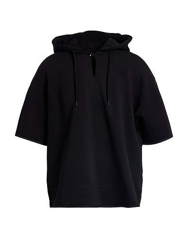 jersey, stretchy fabric, solid color, embroidered logo, synthetic trims, hooded, short sleeves, 1 button, side slit hemline, machine wash, do not bleach, do not tumble dry