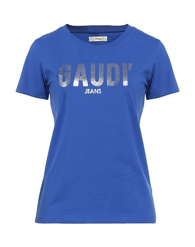 logo-print t-shirt, jersey, stretchy fabric, solid color with print, metallic trim, crewneck, short sleeves, machine wash or dry clean, do not bleach, do not tumble dry