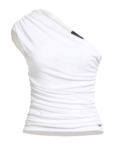 one-shoulder top, jersey, stretchy fabric, solid color, brand logo, draped, hand wash, do not bleach, do not tumble dry