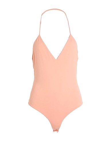 synthetic jersey, stretchy fabric, solid color, no appliqués, deep neckline, sleeveless, hand wash, do not bleach, do not tumble dry, this brand runs small