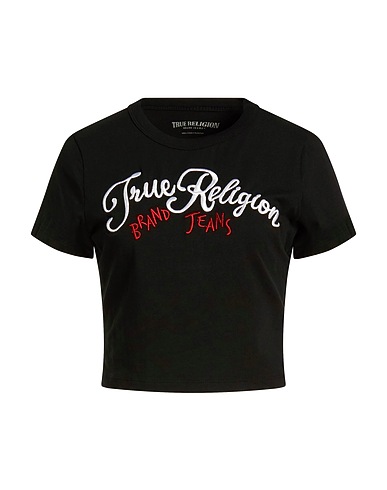 t-shirt, jersey, stretchy fabric, solid color with appliqués, embroidered logo, crewneck, short sleeves, machine wash, do not bleach, tumble dry