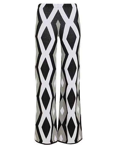 knitted, jacquard, medium-weight knit, no appliqués, geometric-print, mid rise, elasticized waist, regular fit, without pockets, hand wash or dry clean, do not bleach, do not tumble dry, flared pants
