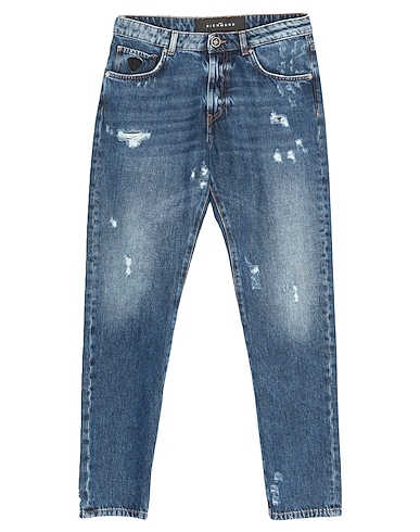 skinny jeans, denim, distressed, solid color, brand logo, studs, dark wash, mid rise, belt loops, regular fit, button fastenings, zipper fastening, pockets, this brand runs small