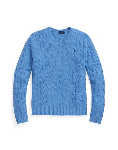 knitted, cable stitch, lightweight knit, brand logo, solid color, round collar, long sleeves, no pockets