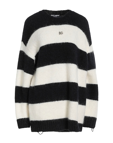 knitted, medium-weight knit, brand logo, striped, crewneck, long sleeves, no pockets, stretch, dry clean, do not tumble dry, do not bleach