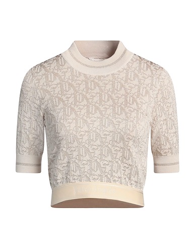 knitted, metallic, lightweight knit, logo-print, brand logo, crewneck, short sleeves, hand wash or dry clean, do not bleach, do not tumble dry