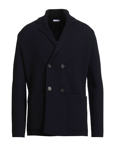 double-breasted blazer, knitted, medium-weight knit, solid color, no appliqués, lapel collar, long sleeves, unlined, button fastenings, patch pockets, dry clean, do not bleach, do not tumble dry