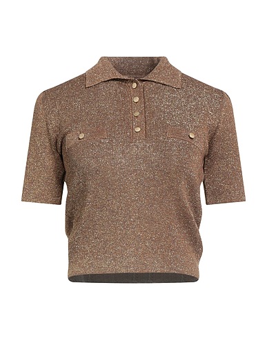 knitted, lightweight knit, metallic, no appliqués, solid color, buttoned neckline, short sleeves, decorative pockets, hand wash or dry clean, do not bleach, do not tumble dry