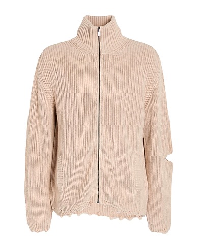 knitted, medium-weight knit, distressed, no appliqués, solid color, long sleeves, zipper fastening, slit pockets, hand wash or dry clean, do not bleach, do not tumble dry