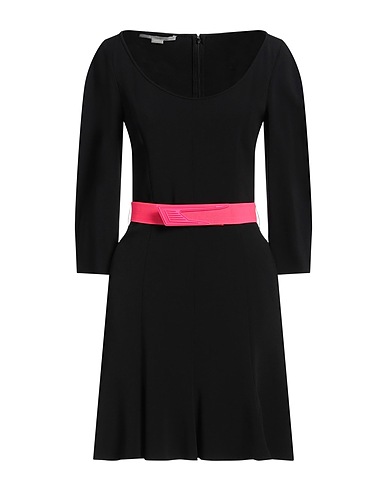 flared dress, crepe, solid color, belt, brand logo, scoop