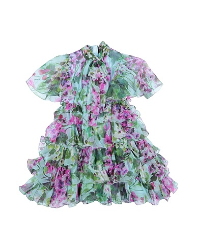chiffon, brand logo, ruffles, floral design, bow-tie neckline, short sleeves, fully lined, zipper closure, no pockets, do not wash, dry clean with delicate solvents, do not bleach, do not tumble dry, iron at 110° c max