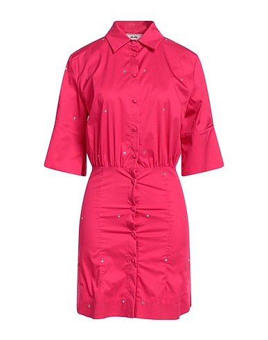 shirt dress, poplin, stretchy fabric, solid color with appliqués, crystals, brand logo, gathered, classic collar, short sleeves, unlined, button fastenings, without pockets, hand wash, do not bleach, do not tumble dry