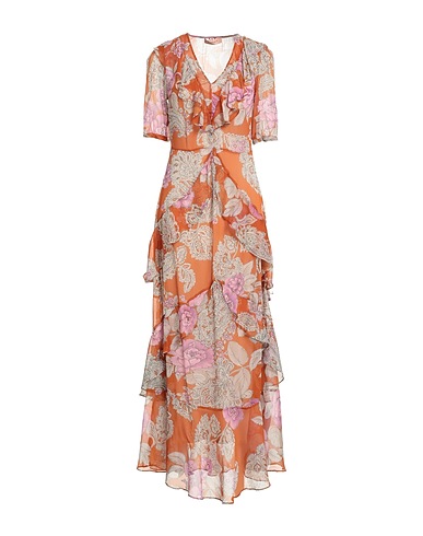 flared dress, crepe, floral-print, tiered, brand logo, ruffles, v-neck, short sleeves, slip to line, zipper fastening, without pockets, hand wash or dry clean, do not bleach, do not tumble dry, be the best-dressed bridesmaid or wedding guest with this designer piece, perfect for any ceremony