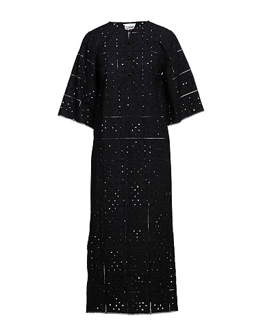 woven, perforated, brand logo, solid color, crewneck, short sleeves, button fastenings, dual back vents, machine wash, do not bleach, do not tumble dry, flared dress
