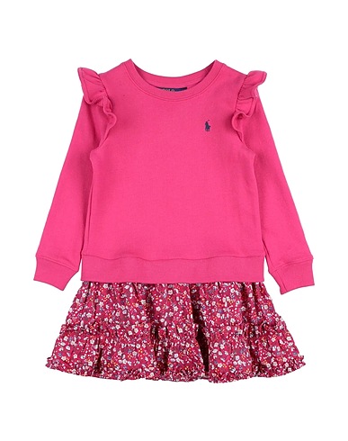 fleece, woven, embroidered logo, ruffles, floral-print, crewneck, long sleeves, unlined, without pockets, machine wash, do not bleach, tumble dry