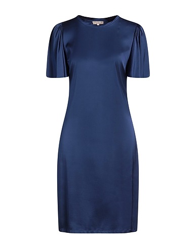 flared dress, satin, solid color, no appliqués, crewneck, short sleeves, unlined, without pockets, stretch, contains non-textile parts of animal origin, machine wash or dry clean, do not bleach, do not tumble dry
