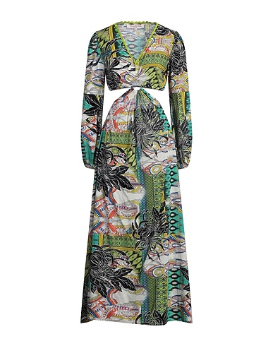 flared dress, woven, multicolor, no appliqués, deep neckline, long sleeves, unlined, without pockets