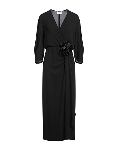 dress, crepe, solid color, draped, brooch, v-neck, 3/4 length sleeves, fully lined, zipper fastening, without pockets, machine wash or dry clean, do not bleach, do not tumble dry