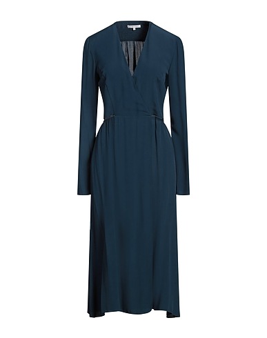 flared dress, crepe, solid color, no appliqués, deep neckline, long sleeves, elasticized waist, hand wash or dry clean, do not bleach, do not tumble dry