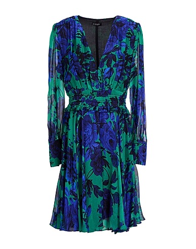 flared dress, chiffon, floral-print, brand logo, v-neck, long sleeves, fully lined, zipper fastening, dry clean, do not bleach, do not tumble dry
