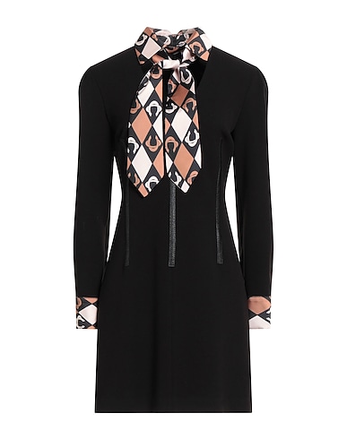 flared dress, jersey, twill, multicolor, coated fabric trims, bow-tie neckline, long sleeves, buttoned cuffs, zipper fastening, stretch, dry clean, do not bleach, do not tumble dry