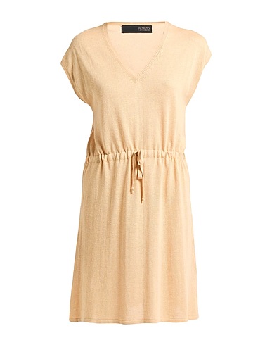 flared dress, knitted, lightweight knit, solid color, no appliqués, v-neck, short sleeves, drawstring waist, hand wash or dry clean, do not bleach, do not tumble dry
