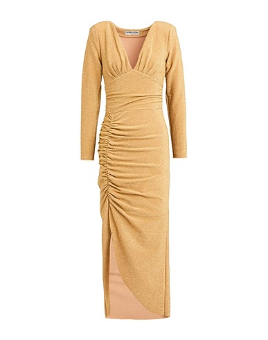 bodycon dress, jersey, metallic, solid color, gathered, deep neckline, long sleeves, shoulder pads, partially lined, front slit, stretch, machine wash or dry clean, do not bleach, do not tumble dry, do not iron, amp up the glamour with chic designer party outfits for your next event or fun night out