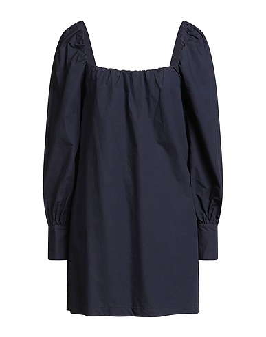 flared dress, woven, solid color, brand logo, off-the-shoulder, long sleeves, buttoned cuffs, fully lined, machine wash or dry clean, do not bleach, do not tumble dry