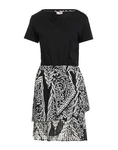 pleated dress, jersey, georgette, stretchy fabric, two-tone, pleated, brand logo, tiered, v-neck, short sleeves, unlined, elasticized waist, without pockets, hand wash or dry clean, do not bleach, do not tumble dry, do not iron