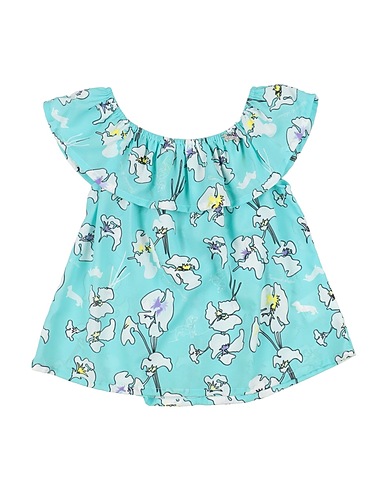 crepe, stretchy fabric, floral-print, brand logo, ruffles, scoop neckline, short sleeves, machine wash, do not bleach, do not tumble dry