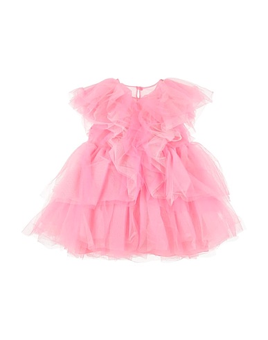 tulle, satin, solid color, tiered, ruffles, brand logo, crewneck, short sleeves, fully lined, button fastenings, hand wash or dry clean, do not bleach, do not tumble dry