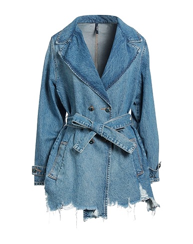 denim jacket, denim, solid color, crystals, belt, medium wash, lapel collar, double-breasted, long sleeves, unlined, button fastenings, multipockets
